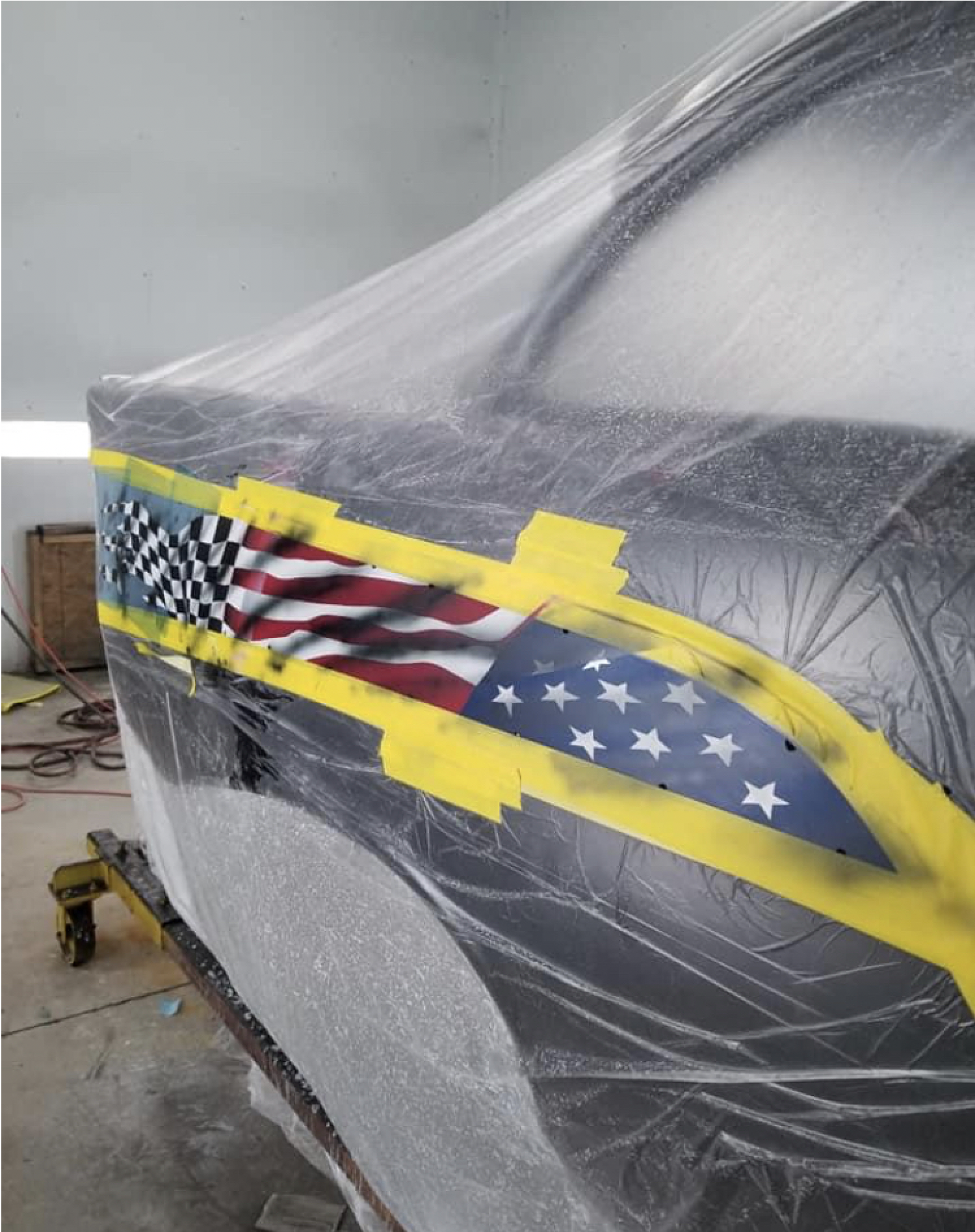 Painting process for the custom airbrush graphic on a 1957 Chevy.